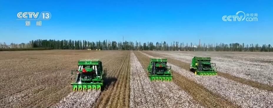 瑪納斯縣南靠天山山脈,土壤肥沃,光熱水土資源豐富,適宜種植棉花,是新疆的重要棉花產(chǎn)區(qū),也是國家級優(yōu)質(zhì)商品棉生產(chǎn)基地,今年當?shù)孛藁ǚN植面積74萬畝。在瑪納斯縣涼州戶鎮(zhèn)呂家莊村的萬畝棉田里,三臺新引進的棉花采收打包一體機正在采收棉花,采棉機能夠高效快速地將棉花從棉稈上脫離,采凈率高達95%以上,一臺采棉機平均每天可采收700多畝棉花,相當于1000名拾花工勞動量的總和。