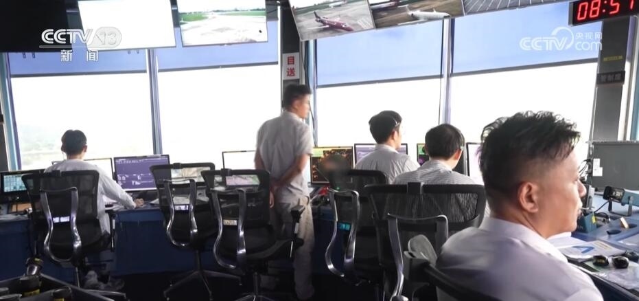 這里就是控制整個(gè)機(jī)場(chǎng)航班的“中樞”所在——空管塔臺(tái),伴隨著一句句簡(jiǎn)短的指令發(fā)出,一架架滿載著旅客的客機(jī)有序起降。管制員們一邊緊盯電腦雷達(dá)顯示器,一邊查看機(jī)場(chǎng)跑道情況,指揮調(diào)控飛機(jī)的飛行線路和高度。
