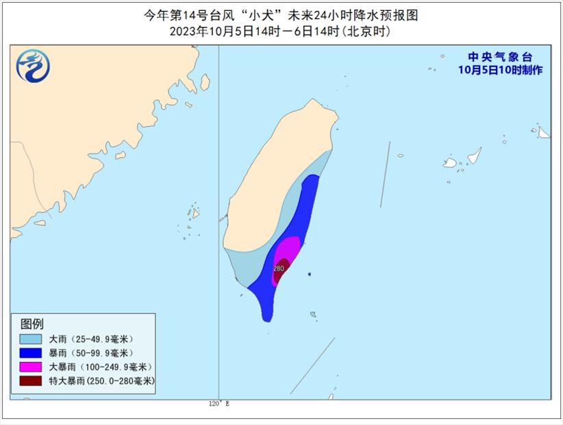 降水預(yù)報(bào):5日14時(shí)至6日14時(shí),臺(tái)灣島東部和南部有大到暴雨,臺(tái)灣島東南部部分地區(qū)有大暴雨,局地特大暴雨(250-280毫米)。