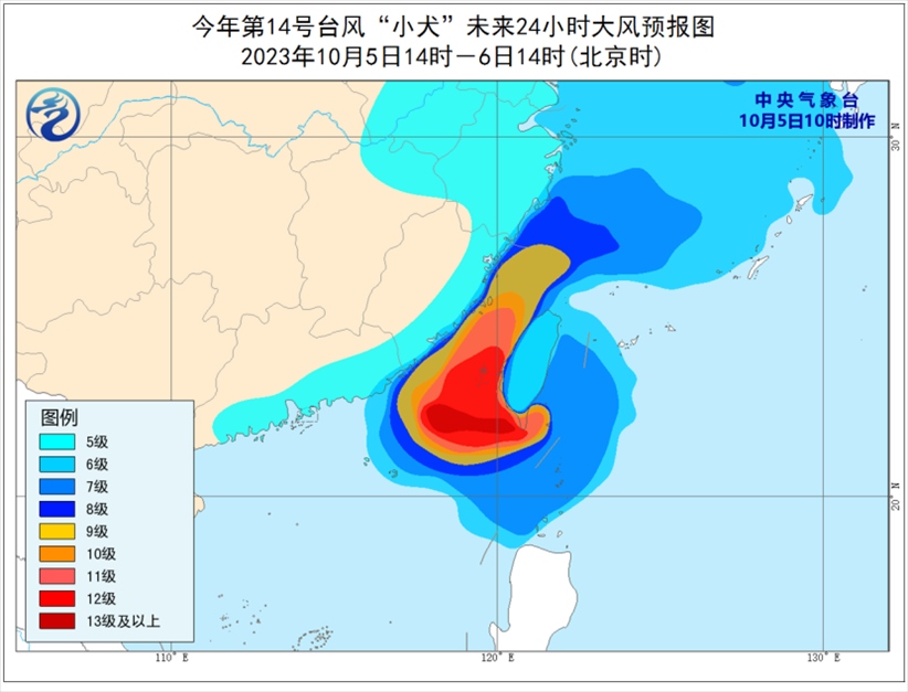 大風(fēng)預(yù)報(bào):5日14時(shí)至6日14時(shí),東海大部及釣魚島附近海域、臺(tái)灣以東洋面、巴士海峽、臺(tái)灣海峽、南海東北部以及浙江沿海、福建沿海、廣東東部沿海、臺(tái)灣島沿海將有6-8級(jí)、陣風(fēng)9-10級(jí)的大風(fēng),其中巴士海峽北部海面、臺(tái)灣海峽、臺(tái)灣島南部及沿海風(fēng)力將有9-12級(jí)、陣風(fēng)12-13級(jí),“小犬”中心經(jīng)過(guò)的附近海面風(fēng)力可達(dá)13-14級(jí),陣風(fēng)15-16級(jí)。