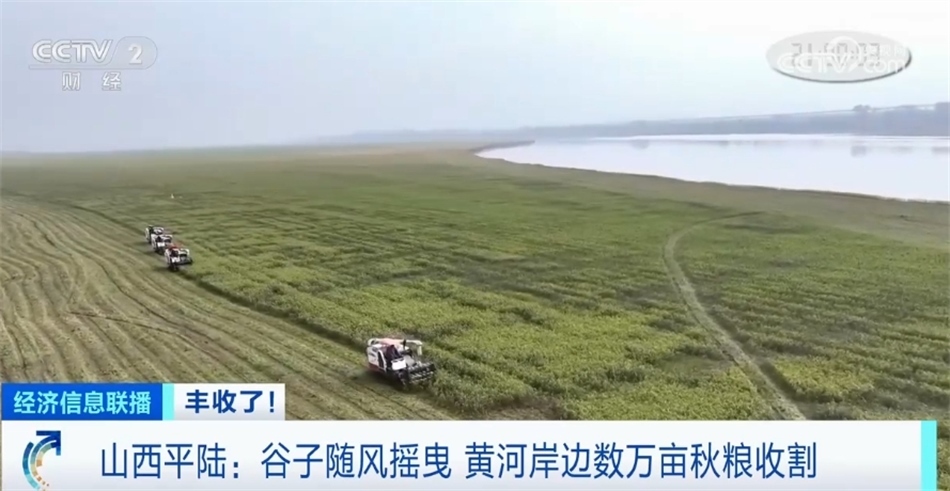 日前,位于山西平陸黃河岸邊的數萬畝秋糧作物迎來豐收,金燦燦的谷子隨風搖曳,忙碌的收割機穿梭田間。我們一起去看看。
