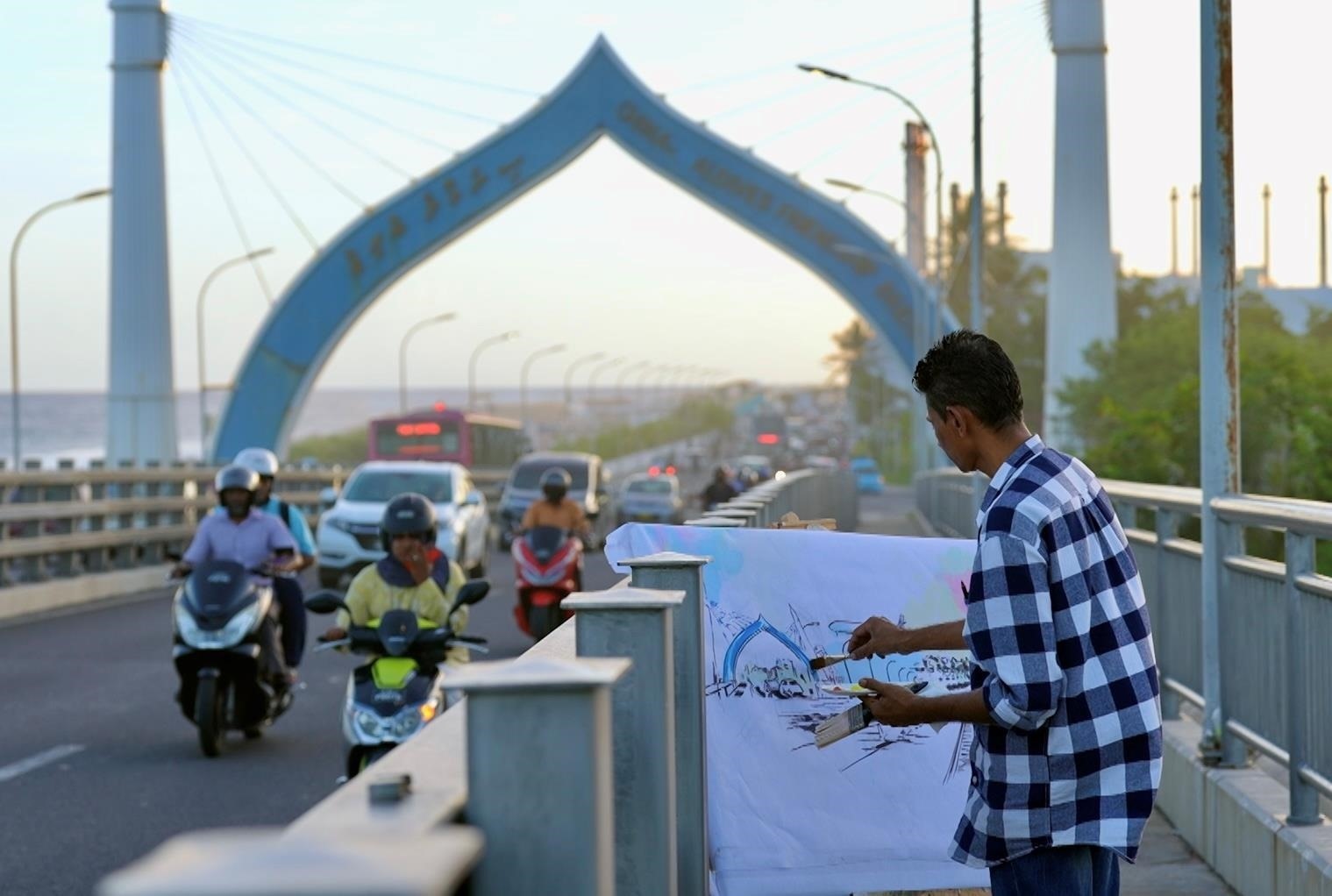 馬爾代夫首都馬累,市中心最熱鬧的花園里,陽光在墻面灑下斑駁樹影,一座大橋跨海而立。這是畫家阿米爾在2016年創(chuàng)作的一幅大型壁畫。
