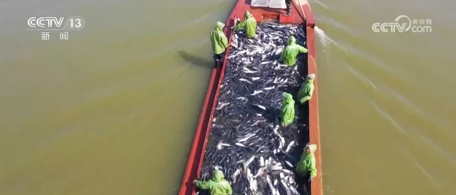 據(jù)了解,大明湖水域面積達(dá)到12.8萬畝,是江西第二大的內(nèi)陸湖泊,十分適合發(fā)展水產(chǎn)養(yǎng)殖。養(yǎng)殖的品種以青魚、草魚、鰱魚、鳙魚“四大家魚”為主。秋捕開始時(shí),漁業(yè)工人用特制的漁網(wǎng)將魚兒驅(qū)趕到特制的長條通道里,再逐步收起漁網(wǎng),工人們在另一端仔細(xì)挑選活魚的品種和大小,體型不達(dá)標(biāo)的魚會被挑出來,放回湖中繼續(xù)養(yǎng)。據(jù)現(xiàn)場工人介紹,2023年因?yàn)轱L(fēng)調(diào)雨順,大明湖迎來一個(gè)豐收年,捕獲上來的活魚一般都在4斤以上,全年總產(chǎn)量預(yù)計(jì)超過200萬公斤。