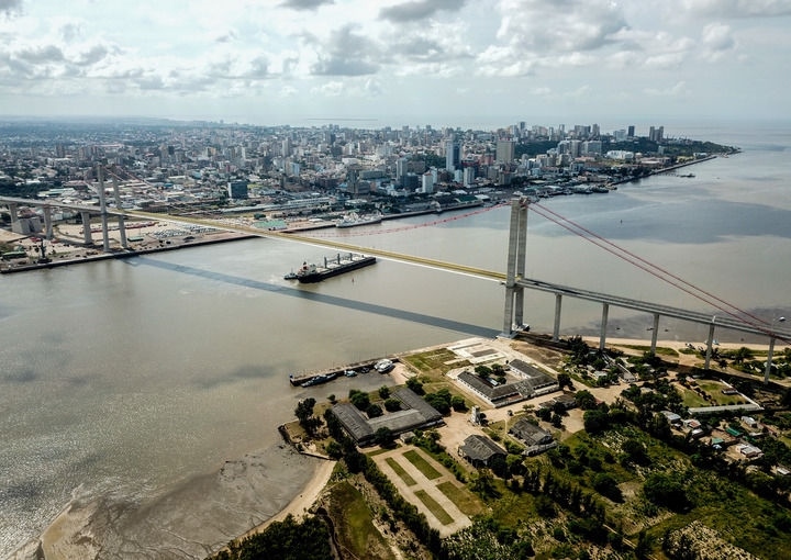 這是2019年4月8日在莫桑比克首都馬普托拍攝的馬普托大橋(無人機照片)。新華社記者 張宇 攝