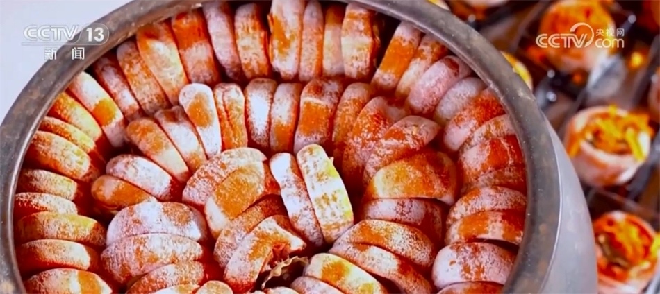總臺(tái)記者 譚海梅:從削皮到吊掛到晾曬,這中間還得在經(jīng)過三次的“捏心”,讓這里面的糖分能夠很好地釋放,從霜降一直到冬至,富平柿子才會(huì)成為口齒留香的柿餅。