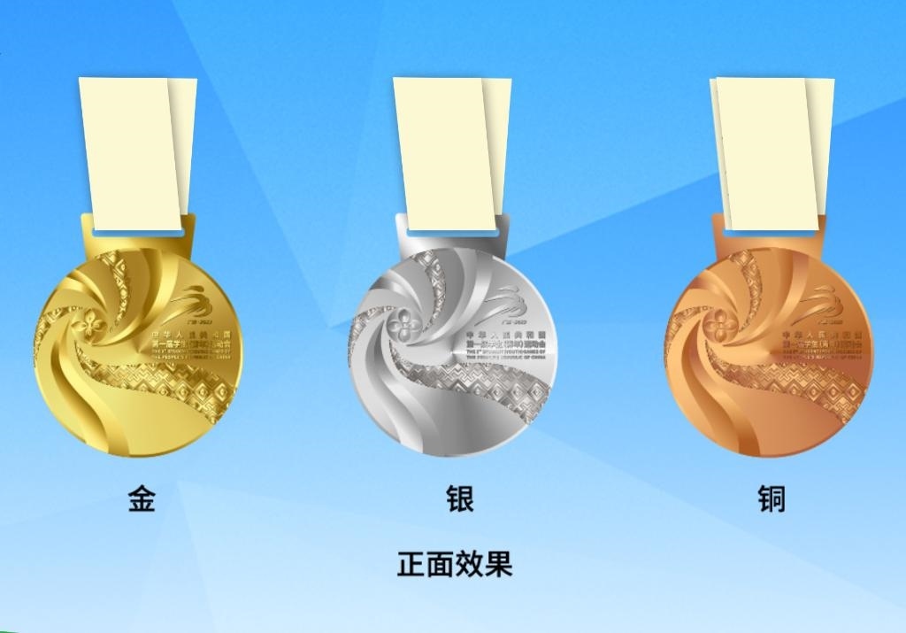 首屆學青會獎牌正面采用繡球、壯錦等廣西元素,以繡球為設計焦點,通過壯錦飄帶向外綻放,如一朵盛開的鮮花,表達歡迎四方友人共赴學青盛會的美意;獎牌背面以廣西銅鼓鼓面為原型,中心太陽紋象征著年輕人的活力和熱情,四方配以圖騰鳥,有著吉祥的寓意;外圈環(huán)繞了學青會的英文名稱和銅鼓經(jīng)典紋飾云雷紋。獎牌整體寓意“團結(jié)、活力、綻放”。