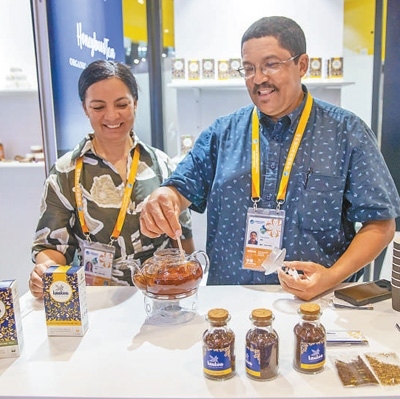 在食品及農產品展區(qū),南非參展商展示當地特產蜜樹茶。本報記者 張武軍攝