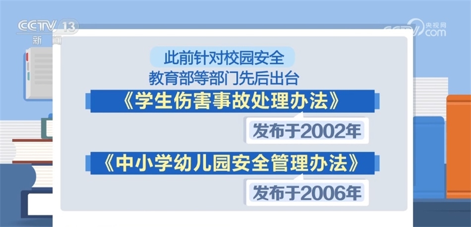 據(jù)介紹,此前針對(duì)校園安全,教育部等部門(mén)先后出臺(tái)了《學(xué)生傷害事故處理辦法》《中小學(xué)幼兒園安全管理辦法》。前者發(fā)布于2002年,后者發(fā)布于2006年,專家認(rèn)為,這兩條《辦法》作為規(guī)范性文件,制定時(shí)間久遠(yuǎn),一些規(guī)定較為籠統(tǒng),亟待更新和修訂。