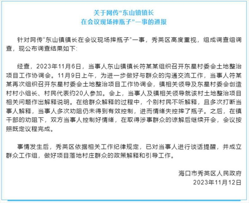 ·??谛阌^(qū)通報(bào)“東山鎮(zhèn)鎮(zhèn)長在會議現(xiàn)場摔瓶子”:已對當(dāng)事人進(jìn)行談話提醒。