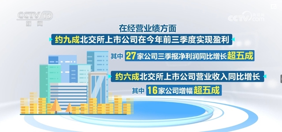 在經(jīng)營業(yè)績方面,約九成北交所上市公司在2023年前三季度實現(xiàn)盈利。其中,27家公司三季報凈利潤同比增長超五成。約六成北交所上市公司營業(yè)收入同比增長,其中,16家公司增幅超五成。
