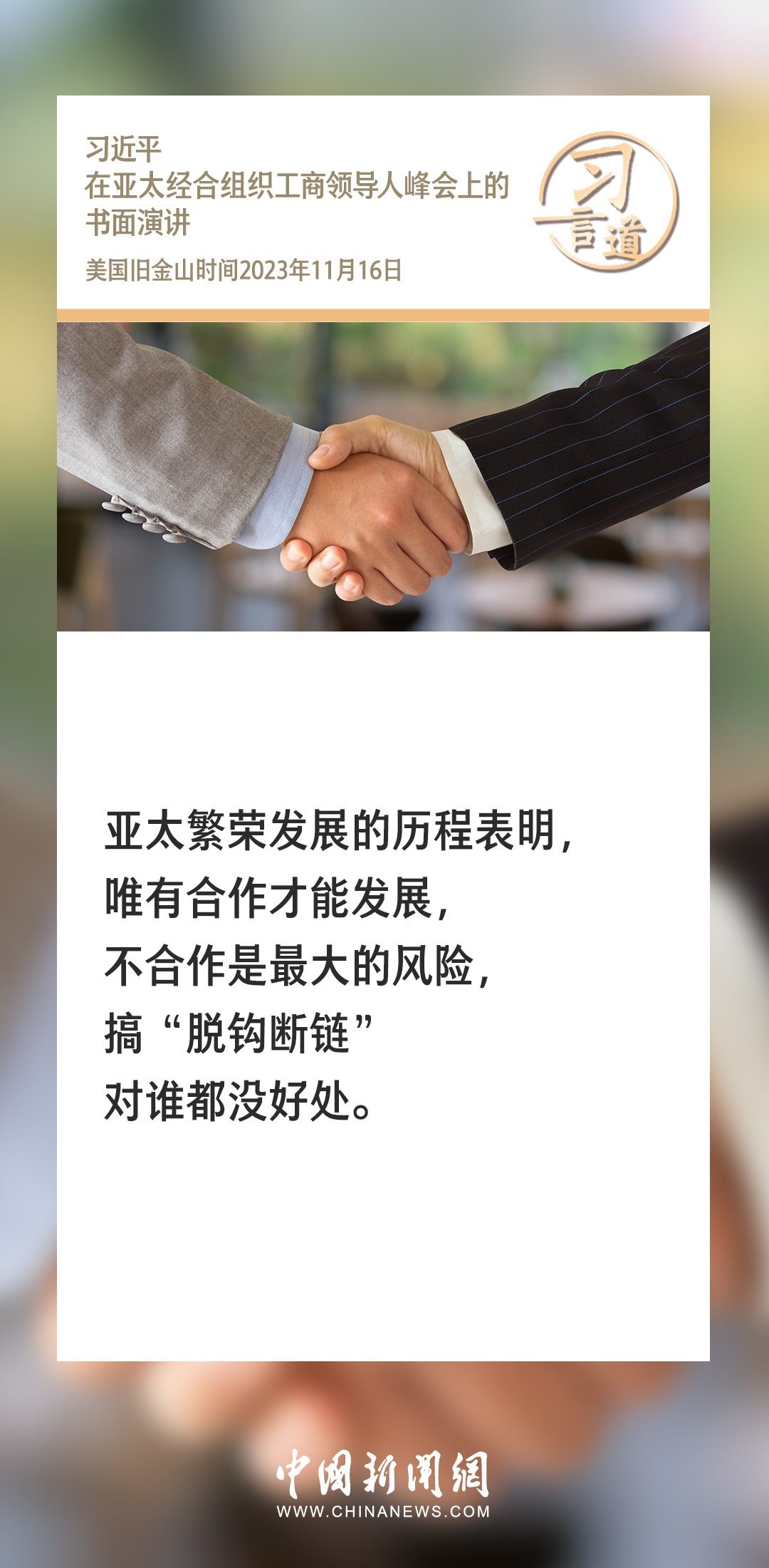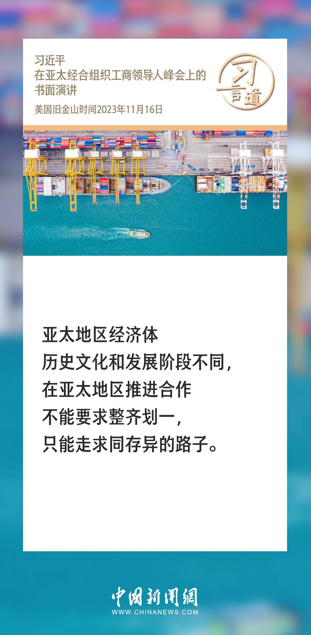 當?shù)貢r間11月16日上午,國家主席習近平向在舊金山舉行的亞太經合組織工商領導人峰會發(fā)表題為《同心協(xié)力 共迎挑戰(zhàn) 譜寫亞太合作新篇章》的書面演講。習近平指出——