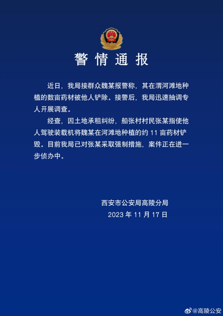 ·西安警方通報(bào)“十多畝藥材被鏟毀”:已對(duì)指使者采取強(qiáng)制措施。