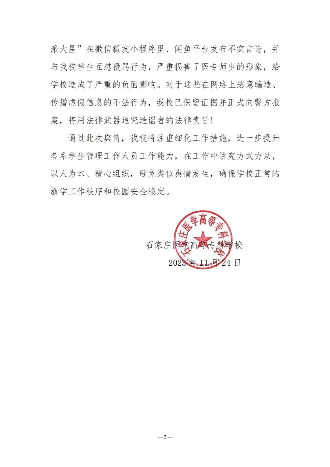 央視網(wǎng)消息:近日,網(wǎng)傳石家莊醫(yī)學(xué)高等??茖W(xué)校檢查學(xué)生宿舍,并將沒收來的物品掛在二手平臺(tái)咸魚上出售,事件引發(fā)關(guān)注。11月24日,石家莊醫(yī)學(xué)高等專科學(xué)校發(fā)布聲明稱,22日學(xué)校利用學(xué)生在宿舍時(shí)間,排查大功率違規(guī)電器。查獲違規(guī)電器分別由各系登記造表、統(tǒng)一保管,定于放寒假時(shí)返還學(xué)生帶回家。經(jīng)核實(shí),網(wǎng)傳短視頻實(shí)為學(xué)生準(zhǔn)備去實(shí)習(xí)一起收拾房間物品時(shí)的視頻,被別有用心人員移花接木、惡意引用。此外,網(wǎng)名為“林北我叫派大星”在微信狐友小程序里、閑魚平臺(tái)發(fā)布不實(shí)言論,并與學(xué)校學(xué)生互懟謾罵行為,嚴(yán)重?fù)p害了醫(yī)專師生的形象,給學(xué)校造成了嚴(yán)重的負(fù)面影響。學(xué)校已保留證據(jù)并正式向警方報(bào)案。