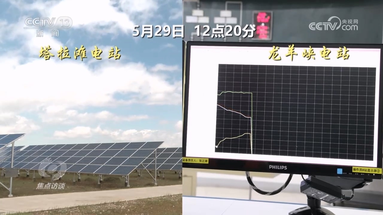 這一天,記者在龍羊峽水電站見到了水電光伏互補的實時情況。12點20分開始,50公里外塔拉灘光伏現(xiàn)場拍攝的影像顯示,有一大片云經(jīng)過光伏電站,光伏發(fā)電輸出立即發(fā)生了變化。這個數(shù)據(jù)變化實時傳到水電站的水光互補系統(tǒng)。