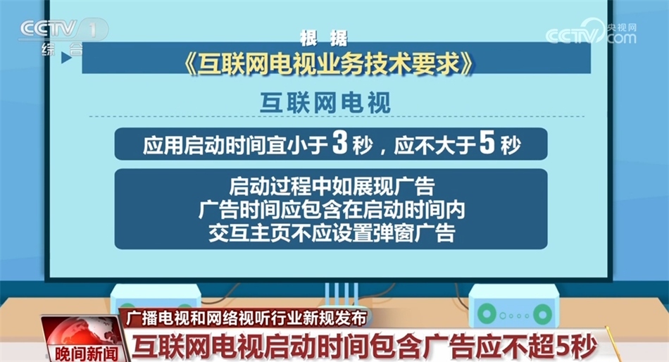 根據(jù)《互聯(lián)網(wǎng)電視業(yè)務技術(shù)要求》,互聯(lián)網(wǎng)電視應用啟動時間宜小于3秒,應不大于5秒,啟動過程中如展現(xiàn)廣告,廣告時間應包含在啟動時間內(nèi)。交互主頁不應設置彈窗廣告。交互主頁應設置顯著、便捷的免費業(yè)務專區(qū)入口。在付費提示方面,互聯(lián)網(wǎng)電視對于業(yè)務的訂購或退訂等相關(guān)操作不應設置“一鍵付費”,對于任何業(yè)務的定期或連續(xù)扣費,均應在扣費前明確、主動提示用戶。