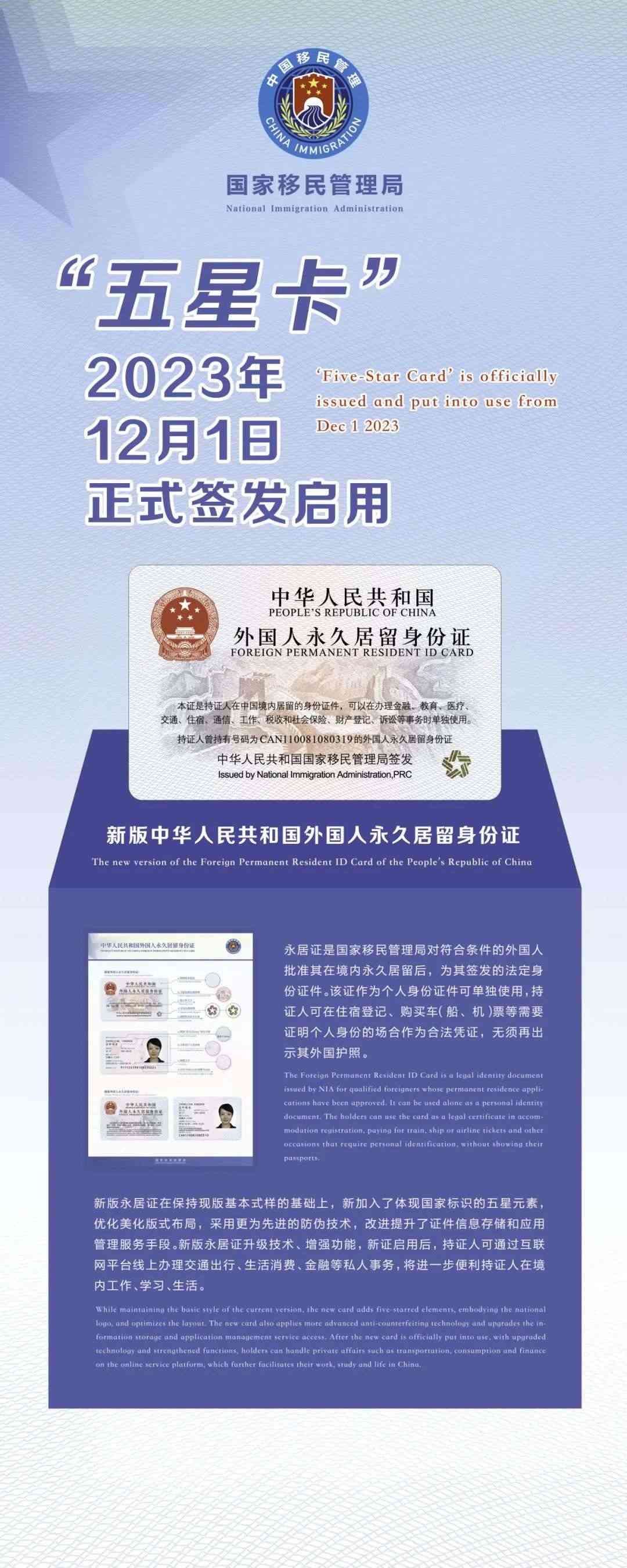 央視網(wǎng)消息:據(jù)國家移民管理局,新版中華人民共和國外國人永久居留身份證12月1日正式簽發(fā)啟用。因加入了體現(xiàn)國家標(biāo)識(shí)的五星元素,新版永居證被稱為“五星卡”。首日共有50名取得在華永久居留資格的外國人領(lǐng)取到了首批“五星卡”。他們來自美國、德國、英國、法國、俄羅斯、瑞典、新加坡、韓國等二十余個(gè)國家,均為在經(jīng)濟(jì)、教育、科技、文化、衛(wèi)生等多個(gè)領(lǐng)域?yàn)橹袊?jīng)濟(jì)社會(huì)發(fā)展做出了突出貢獻(xiàn)人員,當(dāng)中包括中國政府友誼獎(jiǎng)獲得者,在華長期任職工作的外籍高層次管理和專業(yè)技術(shù)人員,在重點(diǎn)院校、科研機(jī)構(gòu)長期從事教學(xué)科研的外籍教授學(xué)者等。當(dāng)天,在北京、天津、上海、廣東等地公安機(jī)關(guān)出入境辦證窗口,還有不少永久居留外國人前來咨詢申請換發(fā)“五星卡”。