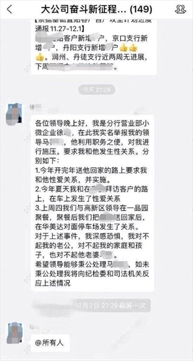 ·江蘇銀行鎮(zhèn)江分行回應(yīng)女員工舉報被領(lǐng)導(dǎo)施壓發(fā)生性關(guān)系:已免去馬某團隊經(jīng)理職務(wù)。