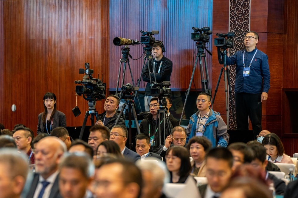 2023年12月5日,記者在云南昆明采訪第五屆世界媒體峰會(云南分會場)暨第二屆大象國際傳播論壇開幕式。新華社記者 胡超 攝