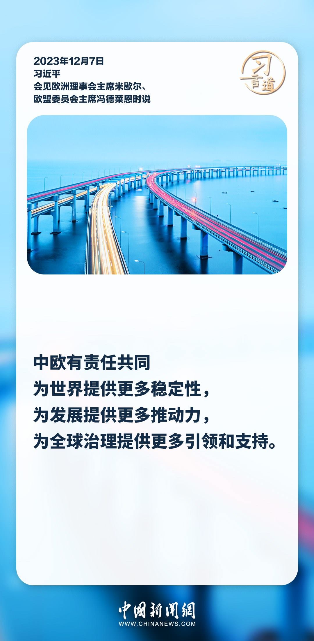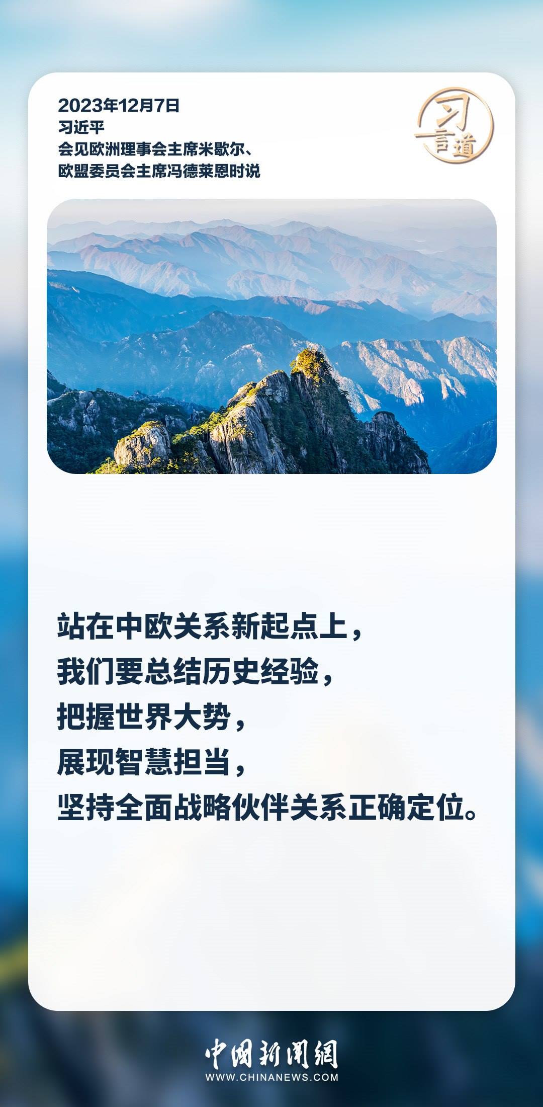 12月7日,國家主席習近平在釣魚臺國賓館會見來華舉行第二十四次中國—歐盟領(lǐng)導(dǎo)人會晤的歐洲理事會主席米歇爾和歐盟委員會主席馮德萊恩。習近平說——