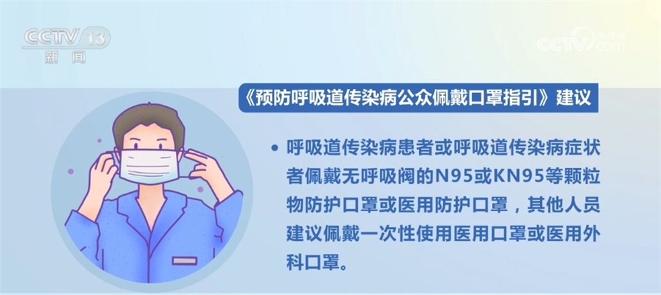 《指引》建議,呼吸道傳染病患者或呼吸道傳染病癥狀者佩戴無呼吸閥的N95或KN95等顆粒物防護(hù)口罩或醫(yī)用防護(hù)口罩,其他人員建議佩戴一次性使用醫(yī)用口罩或醫(yī)用外科口罩。心肺功能障礙患者應(yīng)在醫(yī)生指導(dǎo)下佩戴口罩。兒童呼吸道傳染病患者或呼吸道傳染病癥狀者建議選用兒童防護(hù)口罩,其他兒童建議選用兒童衛(wèi)生口罩。