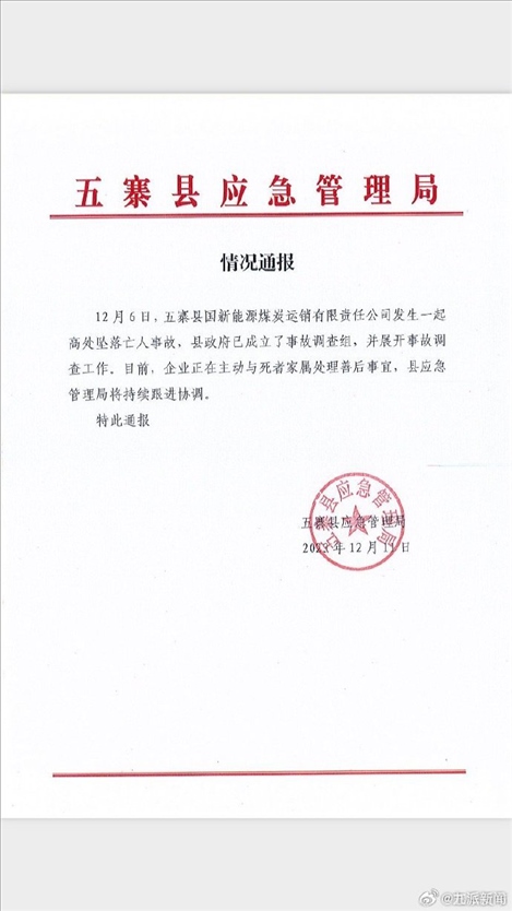 ·國新能源煤炭運銷公司發(fā)生墜亡事故,山西省忻州市五寨縣官方:展開調(diào)查。