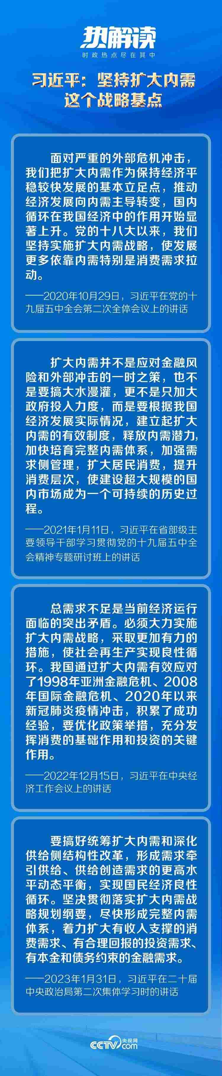 黨的十八大以來(lái),習(xí)近平總書記從我國(guó)經(jīng)濟(jì)運(yùn)行的實(shí)際出發(fā),對(duì)擴(kuò)大內(nèi)需作出了一系列重要論述,為實(shí)施擴(kuò)大內(nèi)需戰(zhàn)略提供了科學(xué)指引。