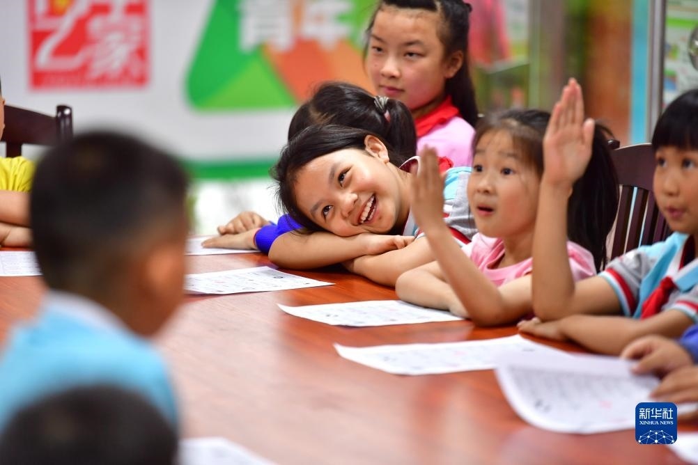 在廣西柳州市融水苗族自治縣易地扶貧搬遷安置小區(qū)苗家小鎮(zhèn)青年之家“六點小課堂”,孩子們參與興趣活動(2022年5月5日攝)。近年來,廣西柳州市融水苗族自治縣團(tuán)縣委在易地扶貧搬遷安置小區(qū)苗家小鎮(zhèn)、苗美社區(qū)開設(shè)青年之家“六點小課堂”,定期組織青年志愿者,為這里的青少年開展功課輔導(dǎo)、自護(hù)教育、科技小課堂等活動。新華社記者 黃孝邦 攝