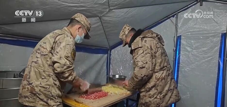 在青海民和中川鄉(xiāng)草灘村美一小學(xué)安置點,官兵們準備食材和面剁餡,他們要在這個特殊的日子,讓受災(zāi)群眾吃上一碗熱騰騰的餃子。帳篷里,群眾和官兵分工協(xié)作,處處洋溢著“家”的溫馨。