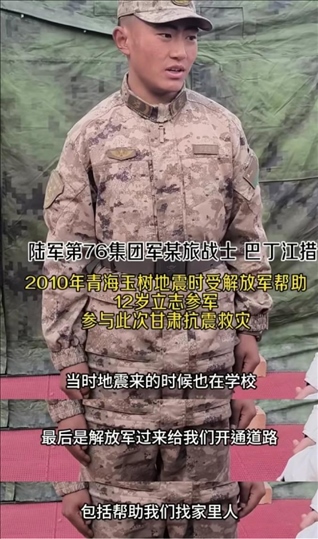 巴丁江措,第76集團(tuán)軍某旅戰(zhàn)士。2010年青海玉樹地震時,解放軍幫他脫險。如今,同樣成為解放軍的他奮戰(zhàn)在甘肅抗震救災(zāi)一線。他說:“我想對以前救我的人說,我?guī)椭烁嗳?,讓他們?yōu)槲因湴粒 ?/p>