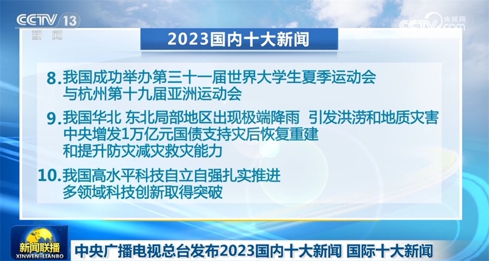 央視網消息(新聞聯(lián)播):中央廣播電視總臺今天(12月27日)發(fā)布2023國內十大新聞和國際十大新聞。