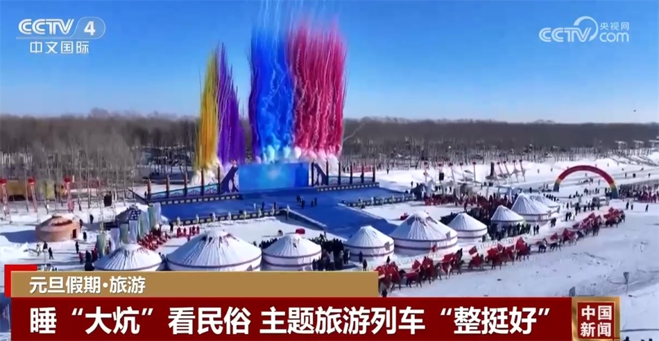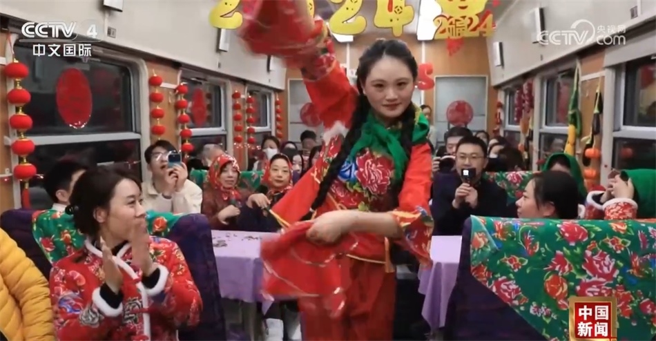 總臺(tái)央視記者 楊曜語(yǔ):我即將登上的列車就是從哈爾濱開往漠河的國(guó)內(nèi)首個(gè)沉浸式東北民俗文化體驗(yàn)列車,坐過(guò)的人都說(shuō)一上車就想盤腿兒了,我們趕緊來(lái)體驗(yàn)一下!一上車我就被濃濃的東北文化所感染到了,整個(gè)車廂都被東北大花的經(jīng)典配色裝飾著,再加上隨手就能品嘗到東北特色美食,坐在床鋪上就感覺一秒鐘“穿越”到農(nóng)家炕頭。