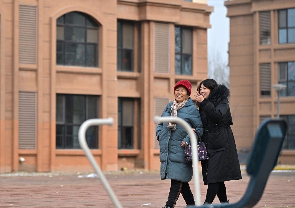 在天津市西青區(qū)辛口鎮(zhèn)水高莊村,村民王玉華(左)在村干部的陪同下熟悉還遷小區(qū)(12月12日攝)。新華社記者 李然 攝