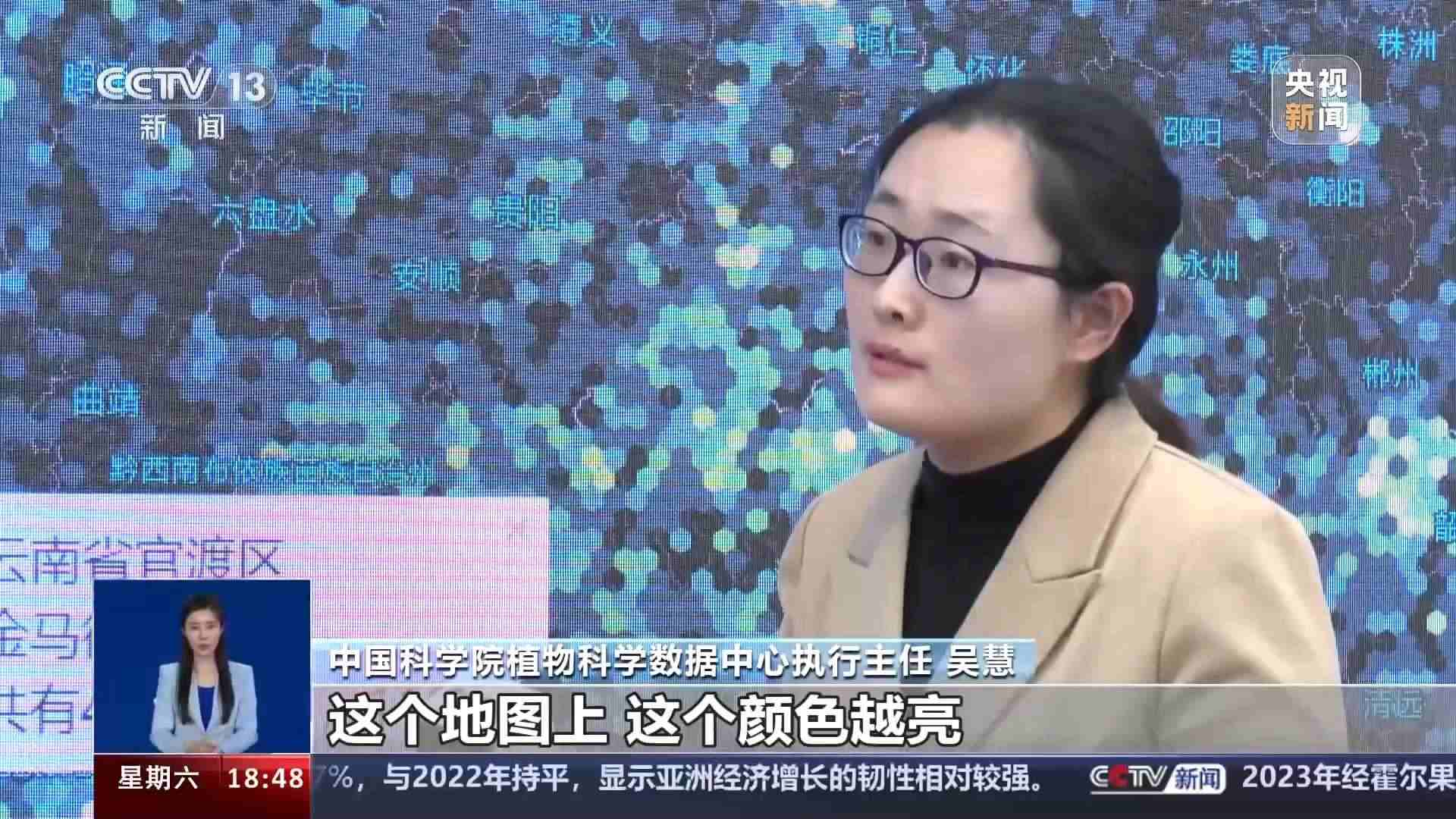 中國科學(xué)院植物科學(xué)數(shù)據(jù)中心執(zhí)行主任 吳慧:這個地圖上,這個顏色越亮,代表這個區(qū)域分布的我們的重點野生植物越多。