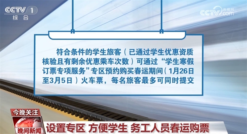 此外,符合條件的學(xué)生旅客(已通過學(xué)生優(yōu)惠資質(zhì)核驗且有剩余優(yōu)惠乘車次數(shù))可通過“學(xué)生寒假訂票專項服務(wù)”專區(qū)預(yù)約購買春運期間(1月26日至3月5日)火車票,每名旅客最多可同時提交6個預(yù)約訂單,每個訂單可添加1個乘車日期的20個“車次+席別”的組合,可選席別為學(xué)生優(yōu)惠票適用的硬座、硬臥、二等座。