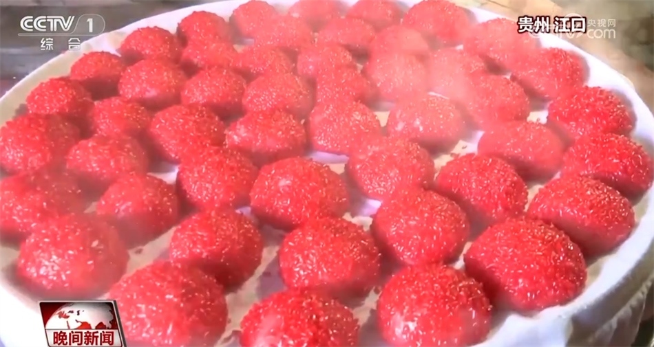 年貨寄托了人們對(duì)來(lái)年的美好期盼。貴州銅仁江口縣的“紅粑粑”寓意幸福美滿,每年春節(jié)前,當(dāng)?shù)厝硕紩?huì)齊聚一堂,制作圓圓的“紅粑粑”等待過(guò)年的到來(lái)。