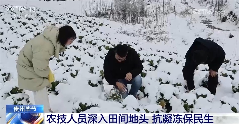 在貴州畢節(jié)螺絲村蔬菜基地,田間地頭白茫茫一片。為應(yīng)對低溫凝凍天氣,當?shù)剞r(nóng)技人員現(xiàn)場查看蔬菜長勢,為農(nóng)戶講解蔬菜防凍知識,指導(dǎo)做好防寒抗凍措施。