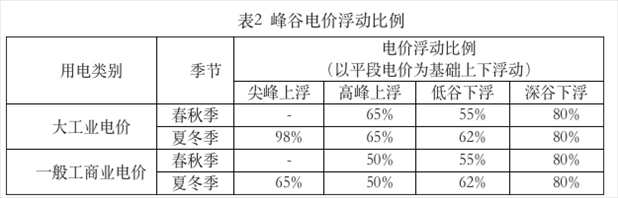 ?。ㄈ┱{(diào)整峰谷電價(jià)浮動(dòng)比例,具體見(jiàn)表2。浮動(dòng)比例以平段電價(jià)為基礎(chǔ),平段電價(jià)包含上網(wǎng)電價(jià)、上網(wǎng)環(huán)節(jié)線損費(fèi)用、系統(tǒng)運(yùn)行費(fèi)用、輸配電價(jià)(不含容(需)電價(jià))、政府性基金及附加。
