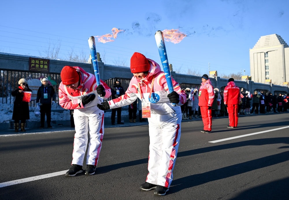 ??2月3日,在內(nèi)蒙古呼倫貝爾市滿洲里國(guó)門景區(qū),火炬手包玲玲(右)和錢卓在火炬?zhèn)鬟f活動(dòng)中。新華社記者 連振 攝