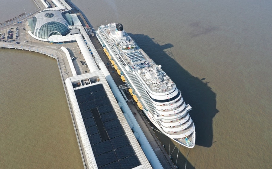 2024年1月1日,“愛達(dá)·魔都號(hào)”在上海吳淞口國際郵輪港正式開啟商業(yè)首航。這是郵輪??吭谏虾卿量趪H郵輪港(無人機(jī)照片)。新華社記者 丁汀 攝