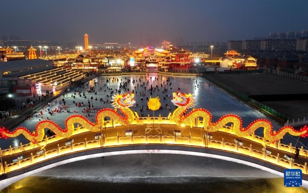 游客在河北省唐山市豐南區(qū)河頭老街滑冰場滑冰(無人機(jī)照片)。