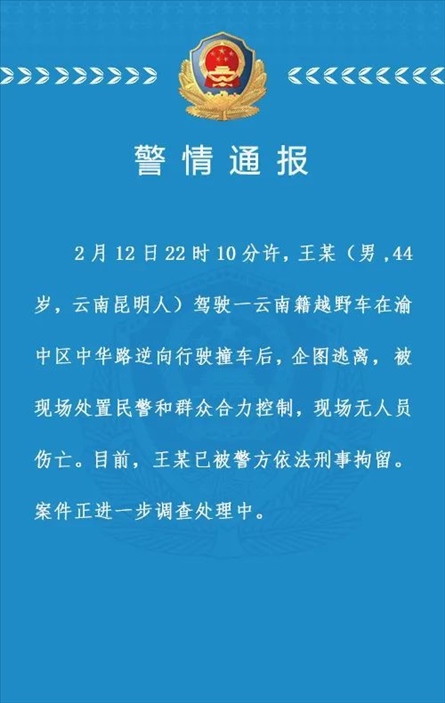 ·重慶解放碑一男子駕車逆行撞車后企圖逃離被刑拘,警方通報。