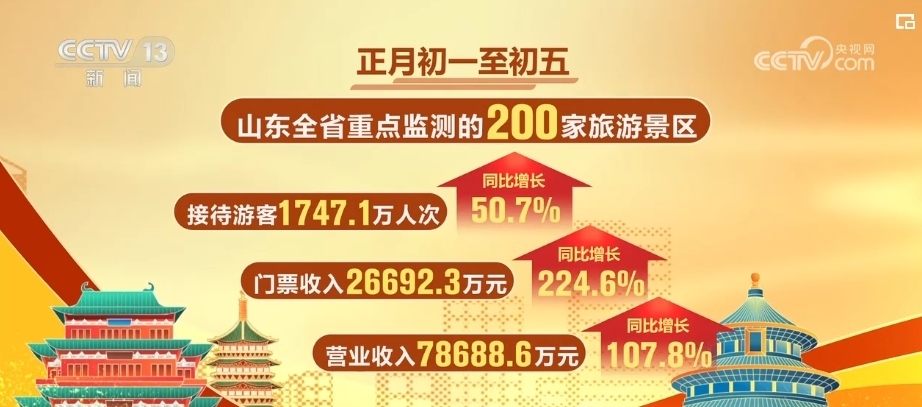 正月初一至初五,山東全省重點(diǎn)監(jiān)測(cè)的200家旅游景區(qū),累計(jì)接待游客超過(guò)1747萬(wàn)人次,門票收入超2.6億元,營(yíng)業(yè)收入超7.8億元,與上年同期相比,分別增長(zhǎng)50.7%、224.6%、107.8%。
