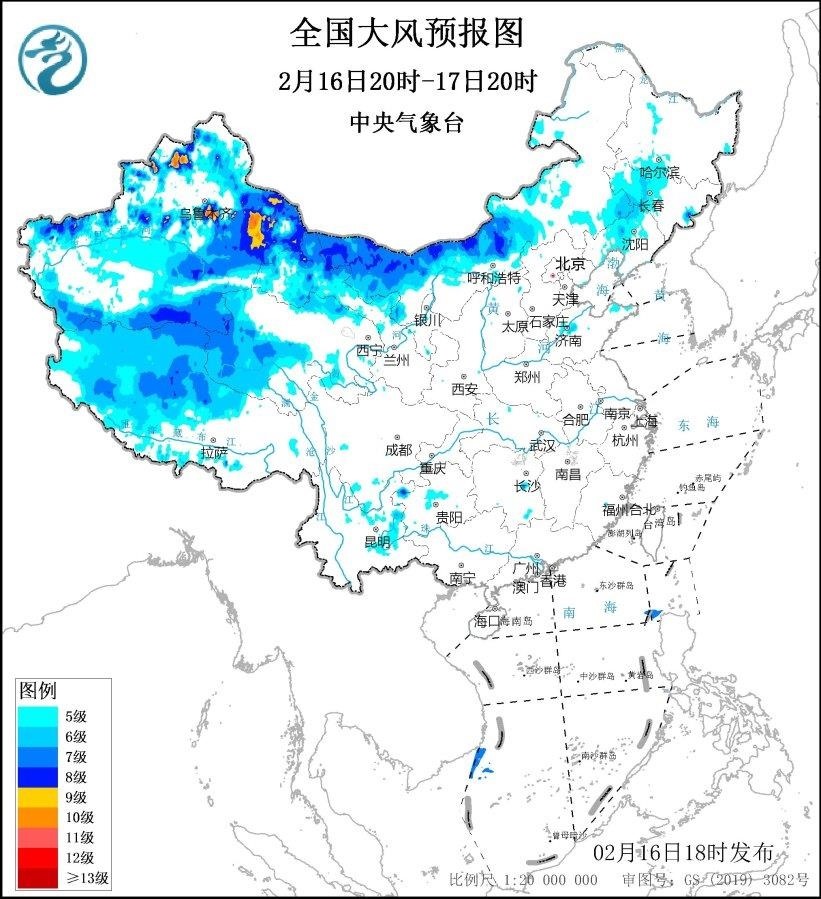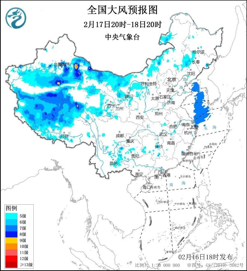2月17日20時(shí)至18日20時(shí),新疆北疆東部和南疆盆地、內(nèi)蒙古西部、青海西南部、西藏西部、甘肅西部等地將有5~7級、陣風(fēng)8~9級的大風(fēng),新疆山口地區(qū)風(fēng)力可達(dá)10級,陣風(fēng)12~13級;黃海大部海域、東海北部海域?qū)⒂?級、陣風(fēng)8~9級的大風(fēng)。