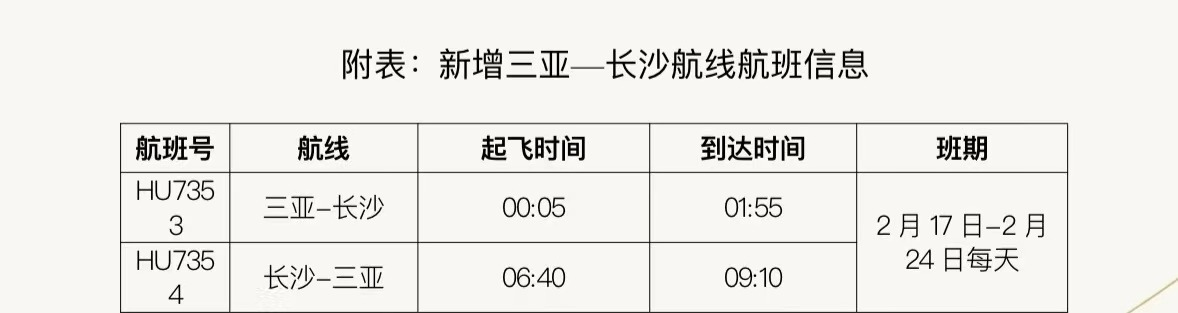 據(jù)悉,在民航局、海南省交通廳的支持下,海南航空積極協(xié)調(diào)申請(qǐng)加班計(jì)劃。2月17日至24日期間,海南航空每日新增三亞—長(zhǎng)沙往返航班。去程航班HU7353,從三亞起飛時(shí)間為凌晨 00:05,到達(dá)長(zhǎng)沙黃花國(guó)際機(jī)場(chǎng)時(shí)間為01:55;返程航班HU7354,從長(zhǎng)沙起飛時(shí)間為06:40,到達(dá)三亞鳳凰國(guó)際機(jī)場(chǎng)時(shí)間為09:10,以上航班信息以實(shí)際查詢?yōu)闇?zhǔn)。旅客可通過(guò)海南航空官網(wǎng)及APP、微信公眾號(hào)及小程序、服務(wù)熱線95339、各直屬售票處及授權(quán)代理購(gòu)買機(jī)票。