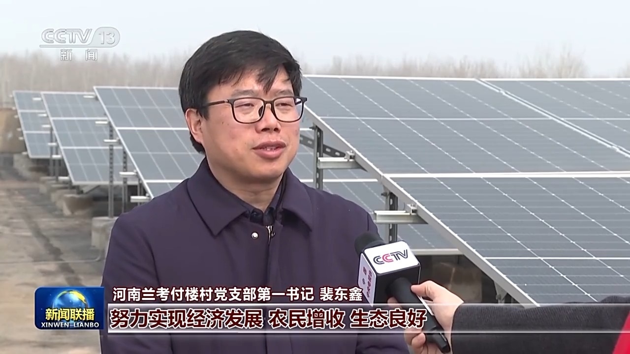河南蘭考付樓村黨支部第一書記 裴東鑫:習近平總書記要我們在綠色發(fā)展中,努力實現(xiàn)經(jīng)濟發(fā)展、農(nóng)民增收、生態(tài)良好。我們大力實施了整個村莊的零碳化改造。現(xiàn)在我們?nèi)迥旯夥l(fā)電量超過120萬度,完全滿足我們整個村子的用電需求,我們村集體一年增收十幾萬元。
