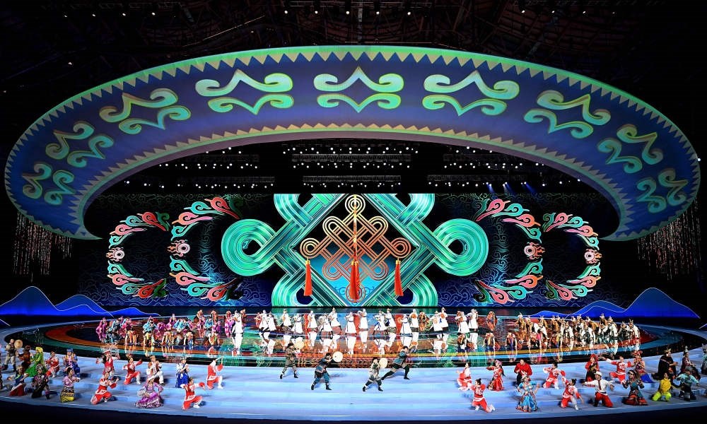 天津年畫、蘇州園林、福建土樓、西藏布達(dá)拉宮……在開幕式的代表團(tuán)入場(chǎng)環(huán)節(jié),各省區(qū)市的人文風(fēng)情和地標(biāo)元素通過剪紙、國(guó)潮風(fēng)彩繪等藝術(shù)風(fēng)格展現(xiàn),搭配著《鄂倫春小唱》《美麗的草原我的家》《駿馬奔馳保邊疆》等耳熟能詳?shù)膬?nèi)蒙古音樂,讓觀眾領(lǐng)略到中華民族輝煌璀璨的文化。