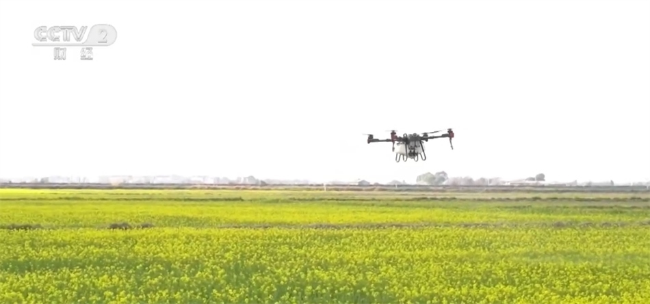 在江西省南昌市新建區(qū)的這個(gè)稻油輪作示范基地,金黃的油菜花競相開放。花海上空,無人機(jī)在專業(yè)人員的操控下,均勻地將肥料和農(nóng)藥噴撒至油菜田間,為油菜提供生長的能量和養(yǎng)分,抑制病菌繁殖,提高油菜結(jié)莢率及產(chǎn)量。