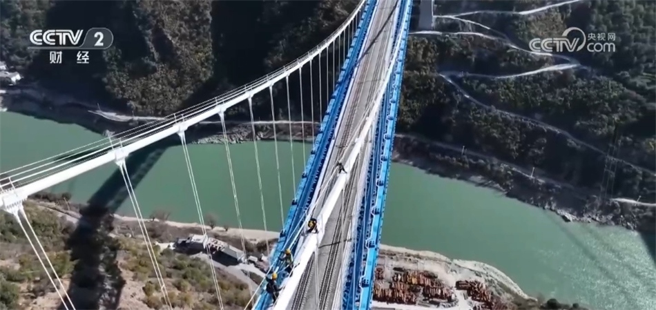 央視網(wǎng)消息:今年,滇藏鐵路麗江至香格里拉段迎來(lái)開(kāi)通后的首個(gè)春運(yùn),在重點(diǎn)控制性工程——虎跳峽金沙江鐵路大橋,一群檢修人員要在距離江面200多米的高空對(duì)大橋進(jìn)行全面檢查,遠(yuǎn)遠(yuǎn)望去就像是在高空“走鋼索”,一起跟隨記者的鏡頭去看看。