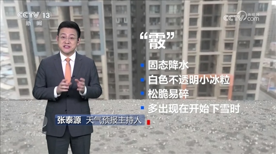 天氣預報主持人張?zhí)┰矗骸啊薄且环N固態(tài)降水,由白色不透明的小冰粒組成,近似球形,有時呈圓錐形,有雪狀結(jié)構(gòu),通常在地面氣溫不太冷時降落,在剛開始下雪的時候出現(xiàn)?!?/p>