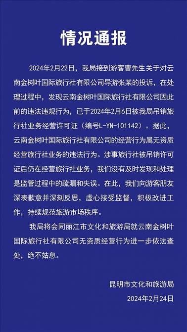 ·游客反映未買手鐲被導(dǎo)游趕下車,昆明文旅局通報:涉事旅行社接團前已被吊銷許可證。